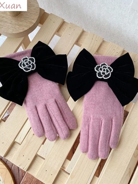 Women Winter Gloves Luxury Cashmere Black Grey Pink Gloves Big Bowknot Beads Rose Flower Touch Screen Female Gift
