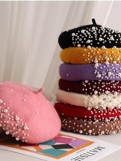 Woolen pearl beret woman Autumn-winter Korean all-matching Japanese painter hat British retro pumpkin hat woman
