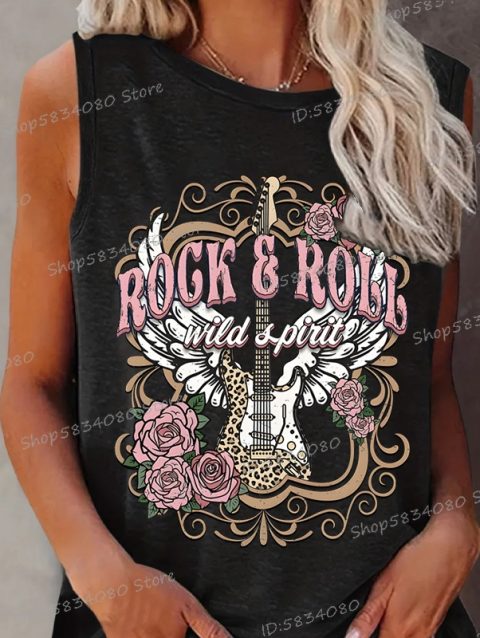 Rock Roll Wild T-shirts Vintage Style Rose Guitar Shirt New Summer Fashion O-Neck Tshirt Music Lover women Sleeveless Tanks Tops