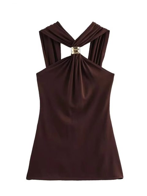 New Halter Tops Fashion Metal Decoration Crop Top Woman 2025 Sleeveless Hanging Collar Short Tops For Women Sexy Party Top