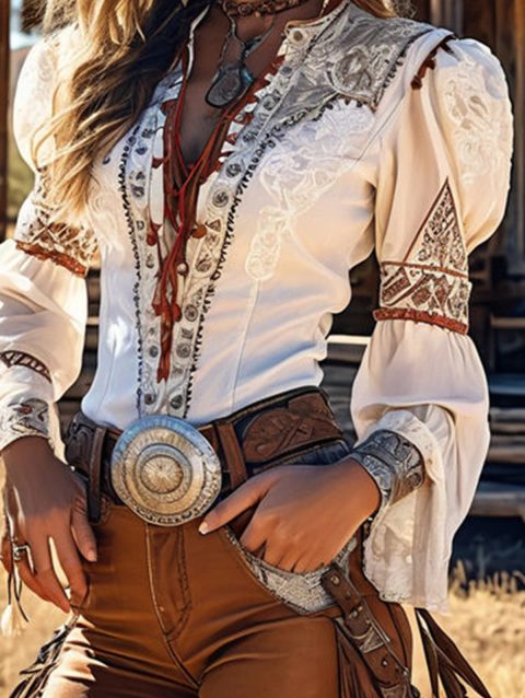 Vintage Western Style Blouse Women Lace-Up Flare Sleeve Boho Cowgirl Top for Summer Music Festival Country Party Outfits