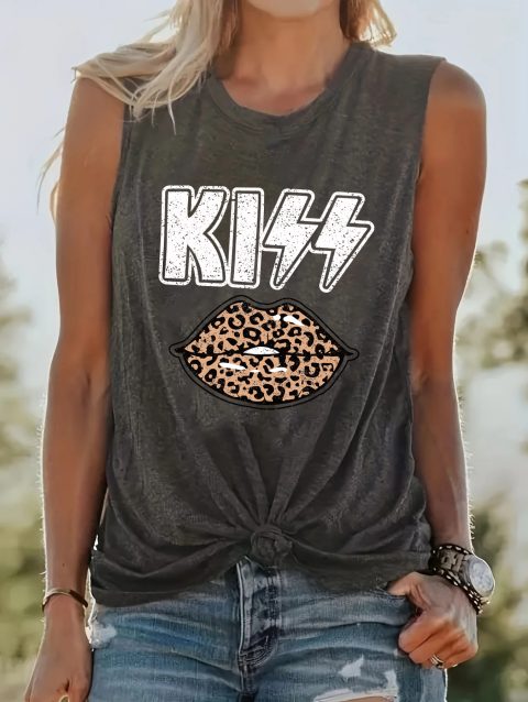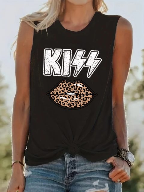 Women’s KISS Leopard print lip print Print Sleeveless Vest White T-shirt Tshirts Creativity Streettshirt Individual Casual Cloth