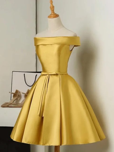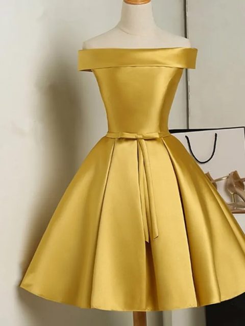 Golden Off The Shoulder A Line Cocktail Dresses Lace Up Satin Short Party Dresses Elegant Wedding Bridesmaid Gowns Evening Gowns