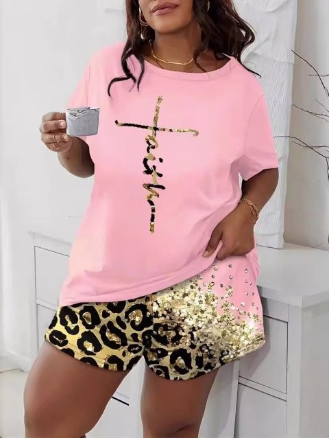 Plus Size Casual Loungewear Set Summer Women’s Plus Tie Dye Short Sleeve Round Neck Tee & Shorts Pajama Two Piece Set