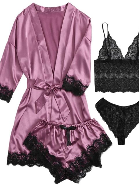 Women Fashion Pajama Print Sexy Lace Trim Faux Silk Satin Pajama Set Gown Skin Friendly Comfort Loungewear Sexy Pajamas
