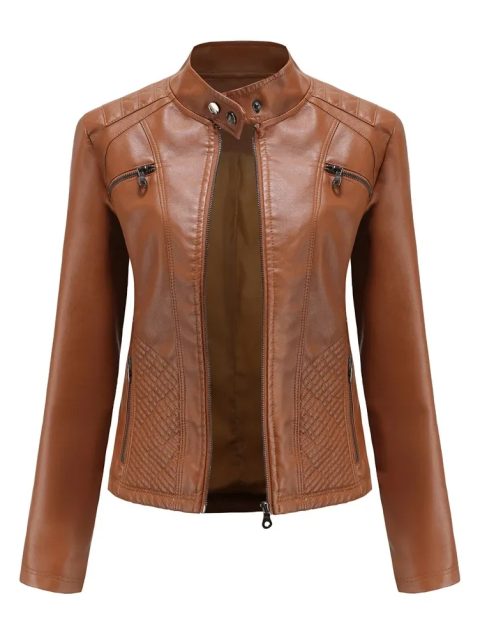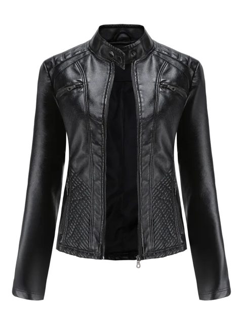 Women coat Autumn New Casual Leather Jacket Standing Collar Long Sleeve Jacket Slim Solid Color Coat Streetwear Zipper Jacket