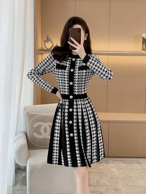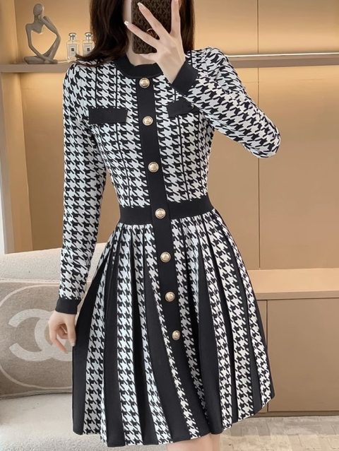 Women Winter Vintage Fashion Commute Elegant Dress Single Breasted Comfortable Knitted Chic Casual Long Sleeve Dresses