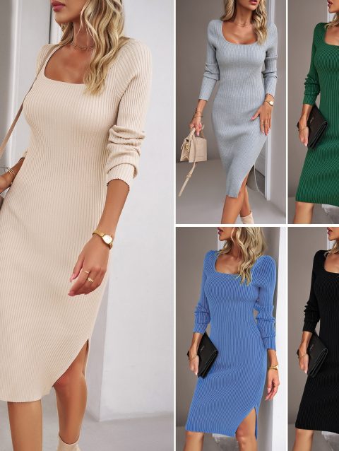 Women’s Dress Autumn Winter Female Solid Color O-neck Sweater Long Sleeve Dress Lady’s Slit Package Hip Dress Women’s Dress