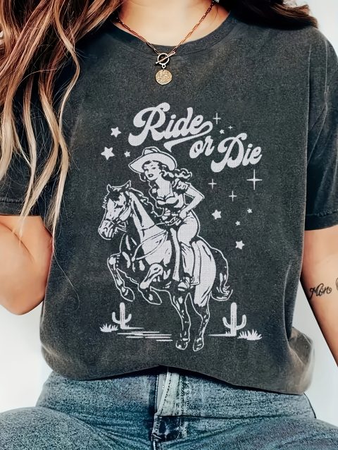 Women’s Ride or Die Western Graphic T-Shirt Cowgirl Riding Horse Cactus Print Crewneck Tee Soft Stretchy Fabric Form Fitting Top
