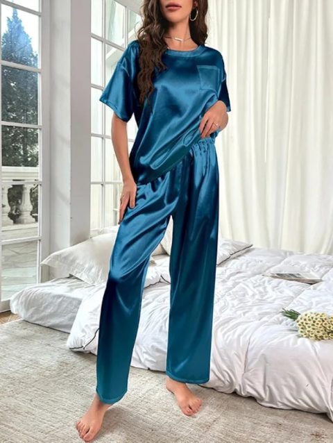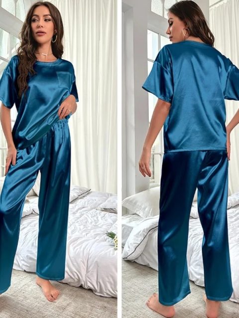 Women’s Satin Pajamas Set Autumn Short Sleeve Top Long Pants Sleepwear 2 Piece Set For Women Casual Home Loose Pajamas Set