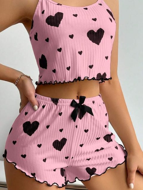 Women’s Summer 2PCS Pajama Set Sling Vest with Shorts 2025 Newly Love Heart Print Spaghetti Strap Camisole Sleepwear for Girls