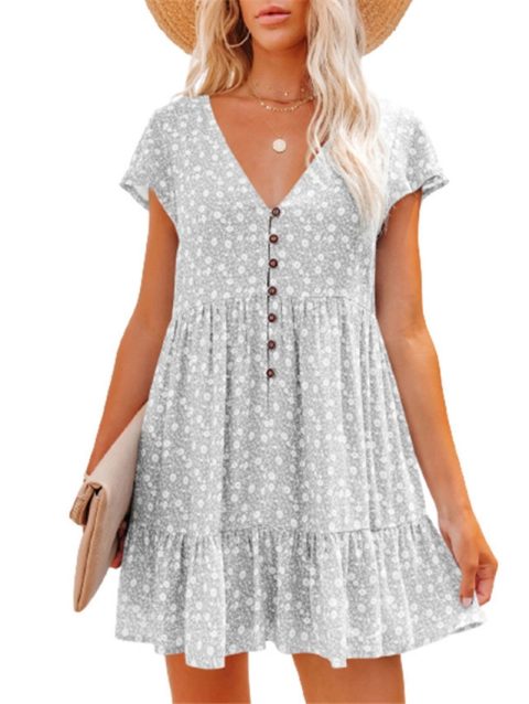 Women’s Summer Sun Dresses Floral Full Print Button Up Dress Women Beach Dress V-neck Casual Loose Dress Women’s Summer Clothing