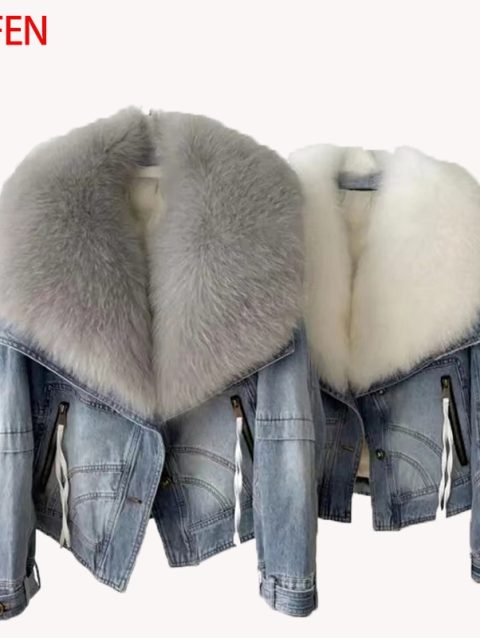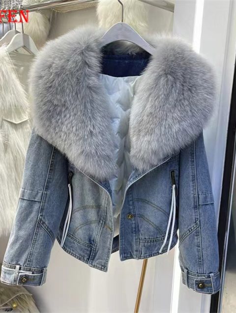 Womens Coats Spring 2025New 100%Natural Real Fox Fur Collar Fashion Short Denim Jacket Luxury Goose Down Puffer Jackets Clothing