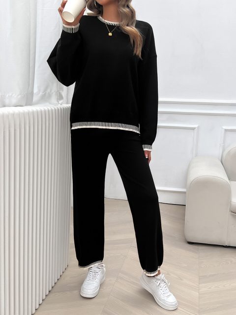 YJKDYK Spring Autumn Women’s Clothing Set Lady’s Contrast Loose O-neck Sweater + Knit Pants Trousers Women 2 Piece Set Outfit