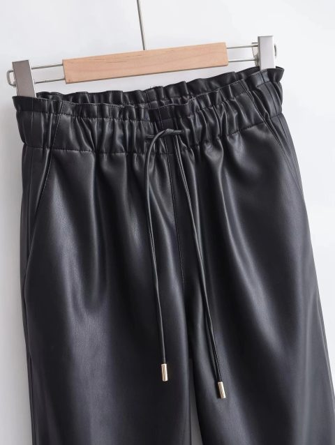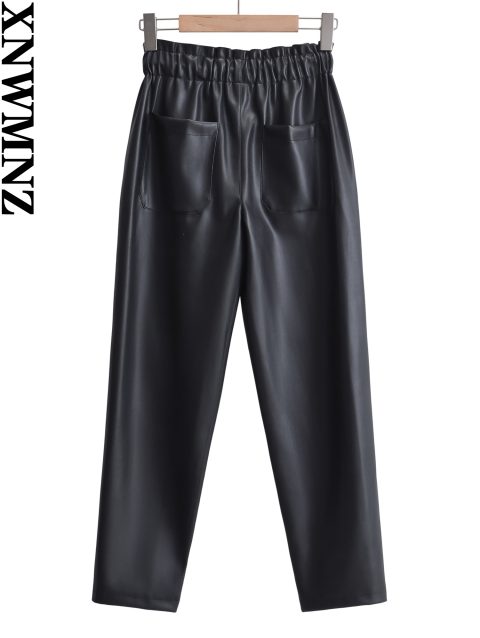 XNWMNZ Women’s Fashion 2023 Faux Leather PU Baggy Trousers Women Vintage Elastic Drawstrings High Waist Versatile Female Pants