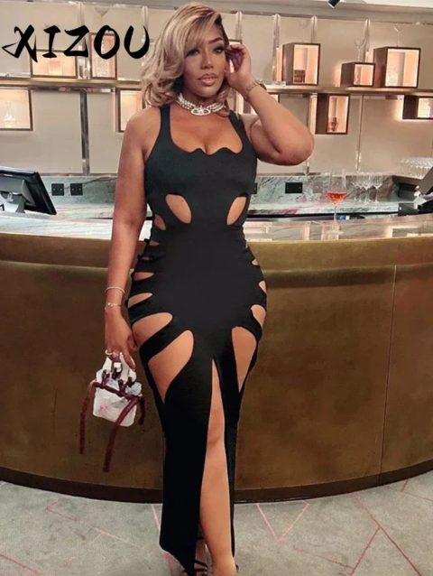 XIZOU Hollow Sexy Dress Women Summer New Sleeveless Split Solid Skinny Stretch Maxi Bodycon Clubwear Coquette Slim Vestidos