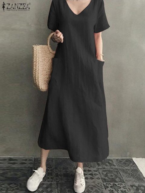 ZANZEA 2023 Women Long Maxi Summer Dress Casual Cotton Linen Ladies Big Pockets Beach Party Robe Femme Vestidos