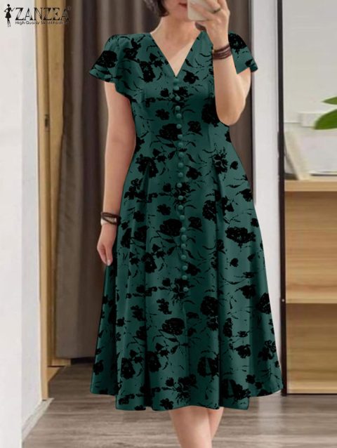 ZANZEA Summer OL Work Ruffle Sleeve Women Midi Dress Casual Floral Print A-line Vestidos V Neck Waist Party Sundress Oversized