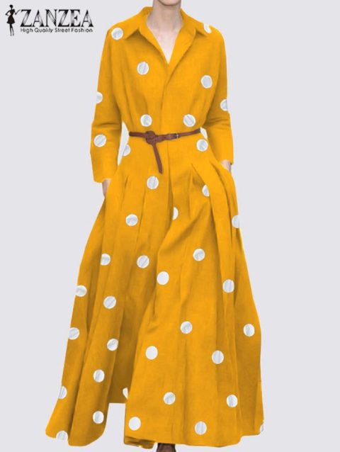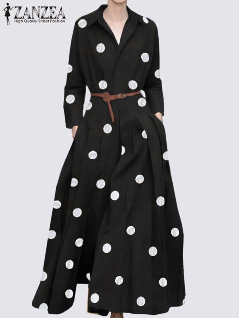 ZANZEA Elegant Polka Dot Robe Longue Women Long Maxi Dress 2023 Summer Bohemian Baggy Kaftan Holiday Casual Lapel Shirt Dresses