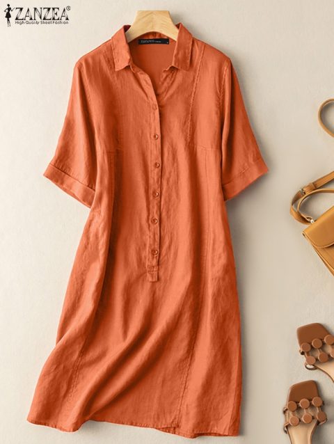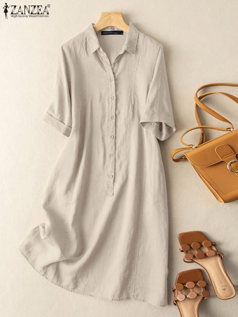ZANZEA Summer Dress Elegant Short Sleeve Dresses Women Vintage Cotton Vestido O-Neck Button A-line Work Sundress Robe Femme
