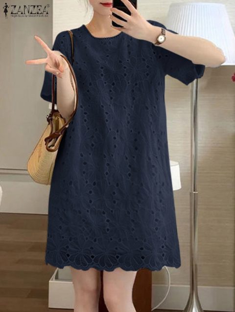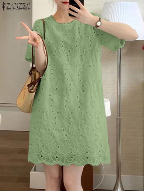 ZANZEA Elegant O Neck Mini Dress Short Sleeve Lace Trim Women Holiday Sundress Openwork Embroidered 2024 Fashion A-line Vestidos