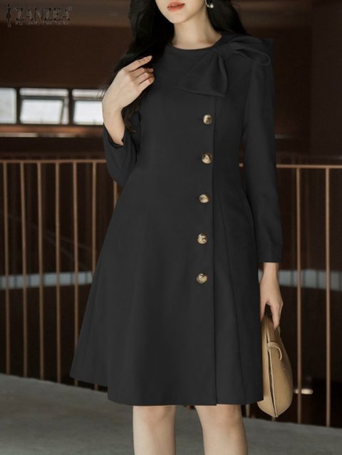 ZANZEA 2024 Summer Elegant Party Sundress Women Bow Tie Neck Knee-Length Dress Casual 3/4 Sleeve Buttons Solid Office Vestidos