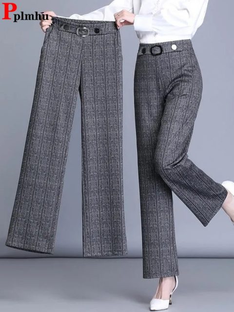 Plaid Office Straight Pants Women Big Size 4xl Korean Casual Baggy Pantalones High Waist Formal Wide Leg Trousers New Spodnie
