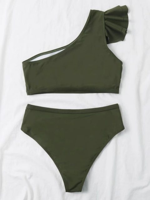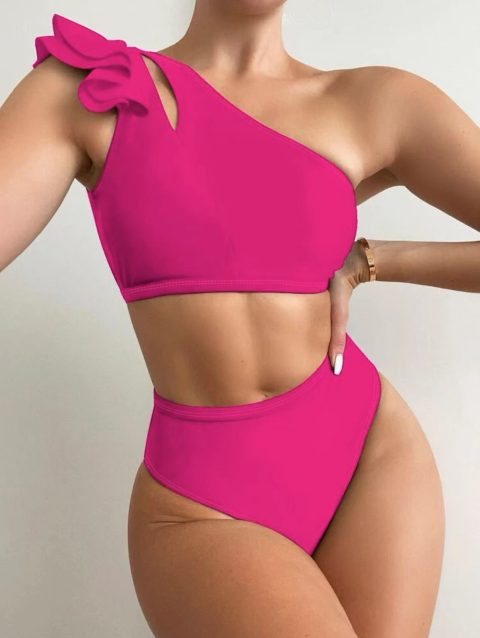 2024 Amazon Hot selling Solid Color Sexy Split High Waist One Shoulder Flying Edge Women’s Bikini Swimsuit