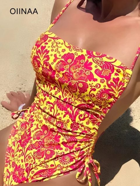 OIINAA Swimming Suit for Women Sexy Floral One Piece Bodysuit 2024 Print Swimwear Summer Drawstring Fashion Lace Up Bathing Suit