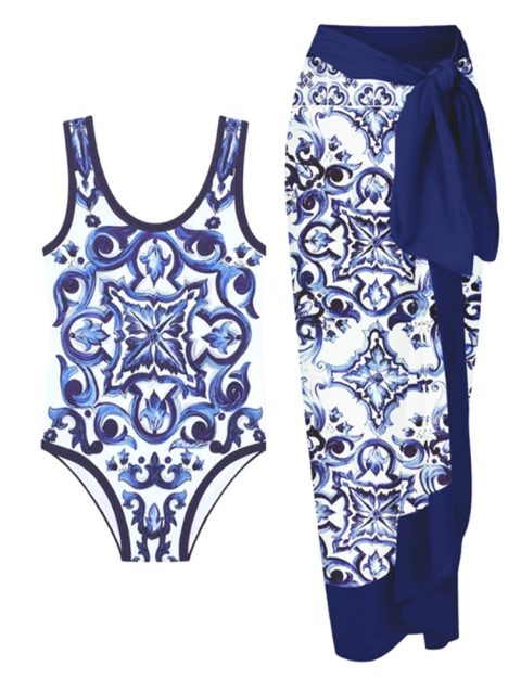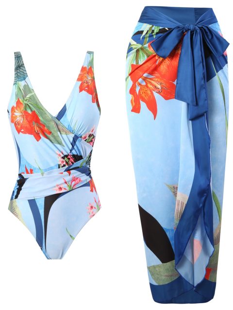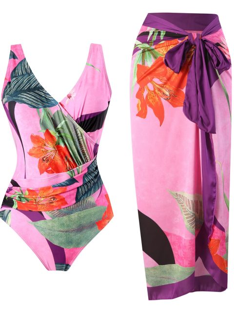 Vintage Printed One Piece Swimsuit and Cover Up for Women Fashion Vacation Bikini Elegant Bathing Beachwear Luxury Swimwear 2024