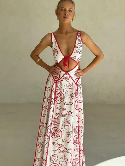 2025 New Sexy Vintage Print V Neck Cutout Suspender Tie Up Slim Backless Lace Up Women Maxi Dresses Beach Holiday Party Dress