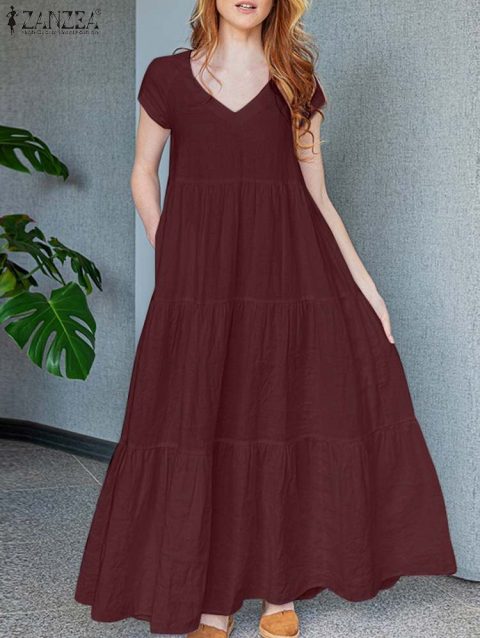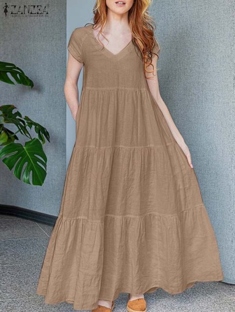 2024 ZANZEA Summer Maxi Long Dress Women Bohemian Holiday Sundress V Neck Short Sleeve Robe Femme Casual Loose Ruffles Vestidos