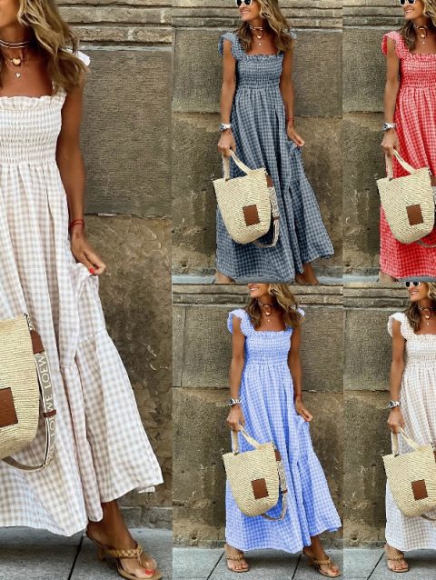 Elegant Plaid Slip Maxi Long Dress Summer Women Strapless Ruffle Backless Pleated Elastic Waist Boho Party Swing Loose Dresses