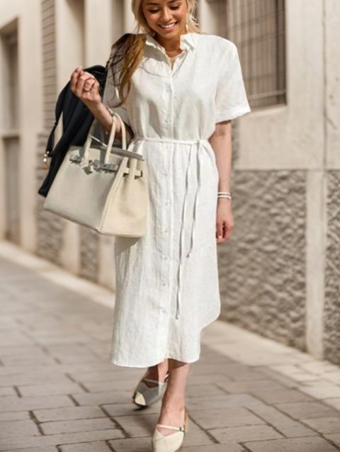 Female Dress Spring Summer New Short Sleeve Turn-down Collar Button Lace Up Fashion Commute Casual Elegant Women A-line Dress