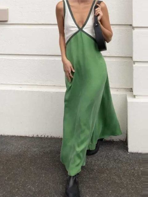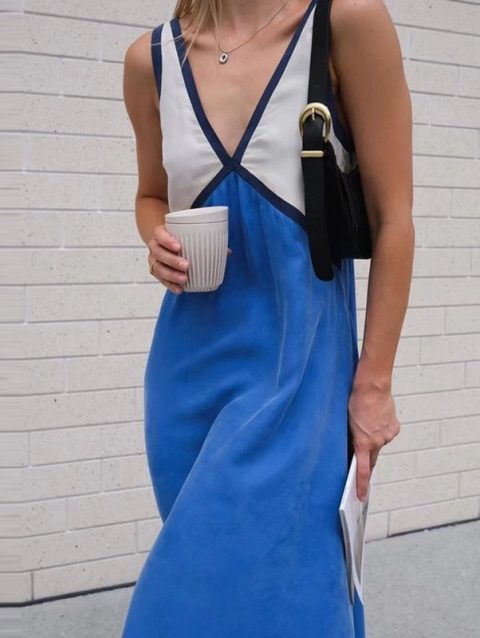 Patchwork Contrast Color Sleeveless Dress Women Sexy V-neck Midi Dresses 2024 Spring Summer Fashion Lady Elegant Casual Robes