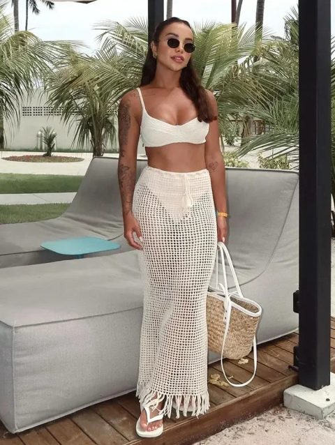 Sexy Summer Knit Cut Out Beach Half Skirt Women Chic Drawstring Fringed Casual Wrap Skirts 2024 Pool Party Swimwear Cover Up K50