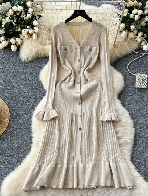 SINGREINY Autumn Office Lady Long Dress Women Winter V Neck Long Sleeves Chic Button Ruffles 2024 Sweet Streetwear Knitted Dress