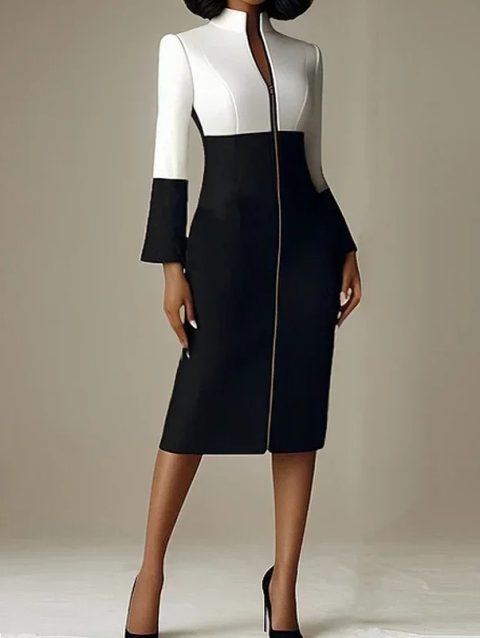 Krisstargirl 2025 New Women’s Bodycon Dresses Contrast Color V-neck with Zipper Long Sleeves Formal Occasion Office Midi Dresses