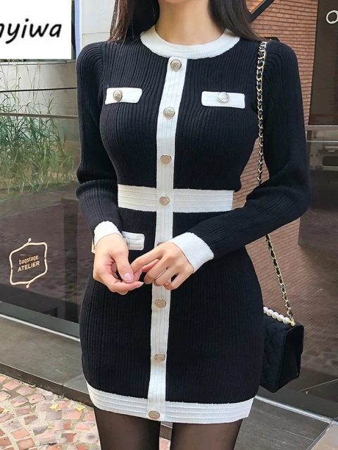 New Knitted Bodycon Long Sleeve dresses for women Fall Mini Sweater Vintage Black Office Korean Short Elegant vestido de mujer