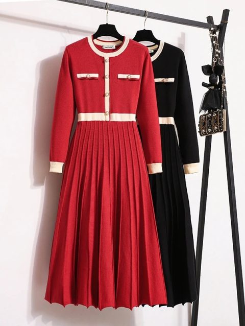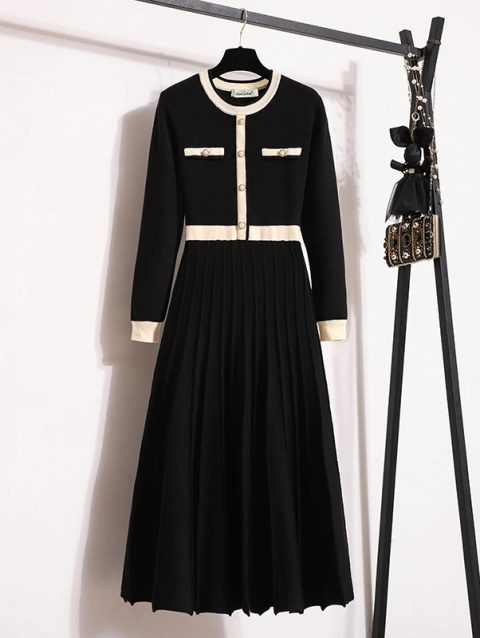 Office Ladies Elegant Knitted Midi Dresses For Woman Long Sleeve High Waist Patchwork A-line Knitting Dresses Vestidos De Fiesta