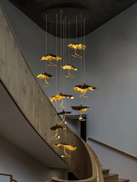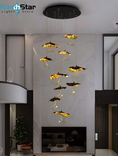 Luxury Designer Copper Lotus Leaf Chandeliers for Staircase Loft Lobby Living Room Lotus Leaf Pendant Hanging Lamp High Ceiling