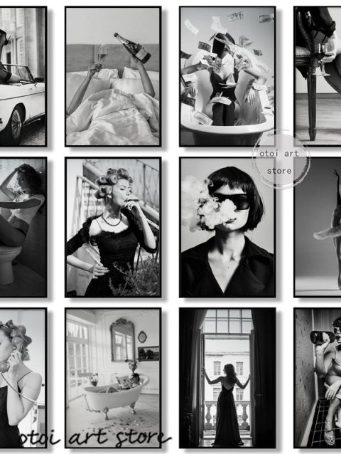Vintage Black White Fashion Photography Style Sexy Woman Drinking Smok Art Poster Canvas Painting Wall Prints Picture Home Decor