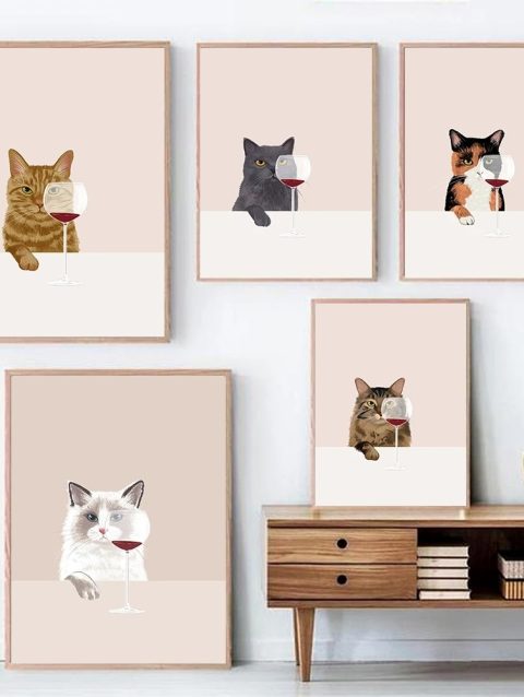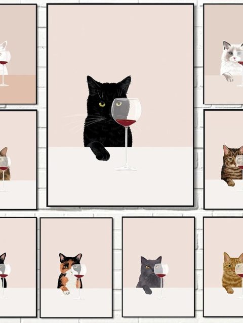 Funny Black White Cats Red Wine Poster And Prints Canvas Painting Cat Lover Wall Art Pictures For Living Room Kitchen Home Decor