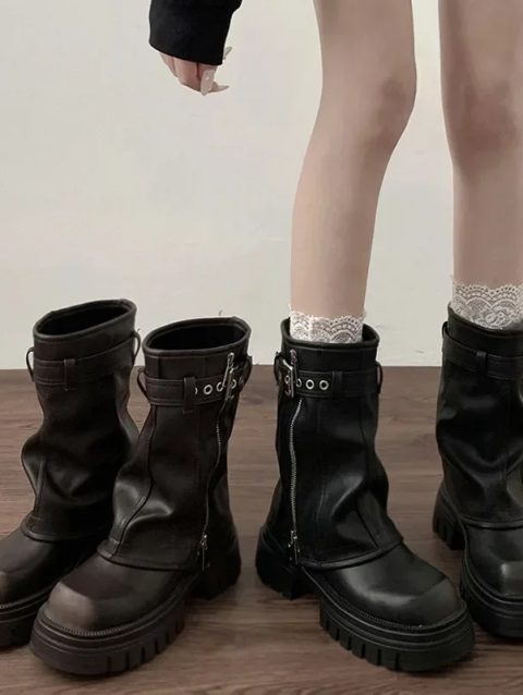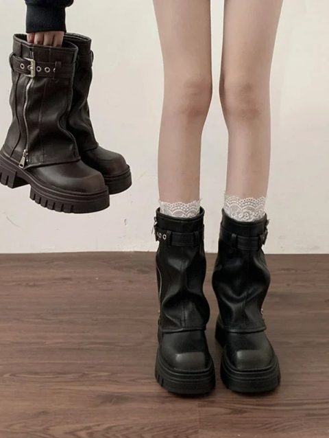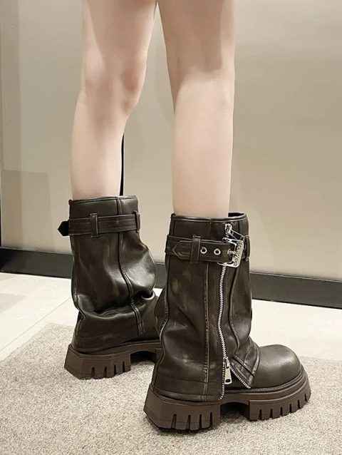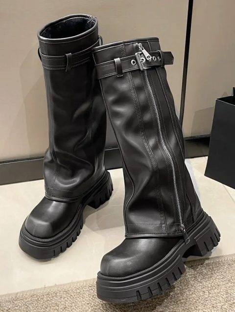 2024 Platform Black Knee High Women Boots Wasteland Y2k Style Vintage Biker Boot Women Brown Belt Buckle Booties Size 35-40