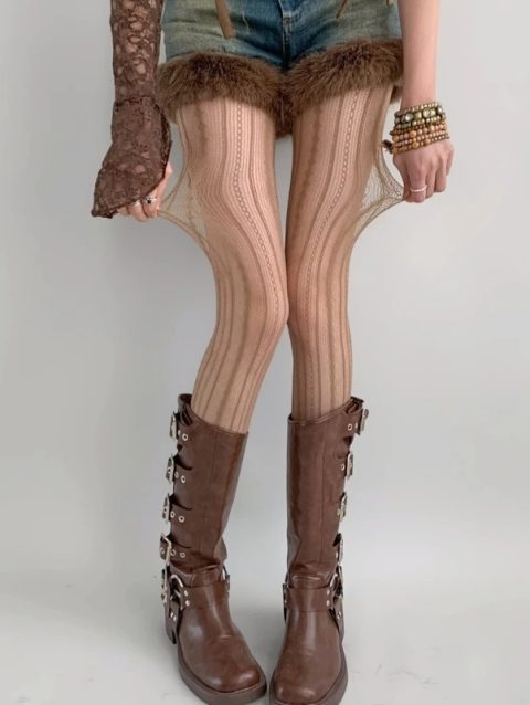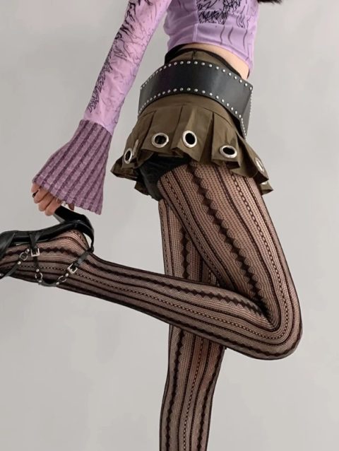 Hollowed Out Lace Tights Geometric Striped Patterned Fishnet Pantyhose for Women