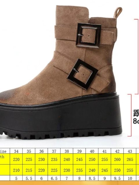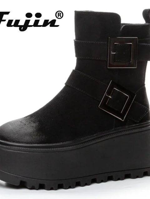 Fujin 8cm Suede Genuine Leather Ankle Booties Women Autumn Boot Flats Winter Plush Thick Sole Motorcycle Platform Wedge Shoes