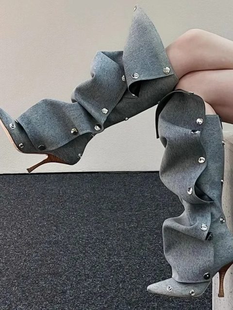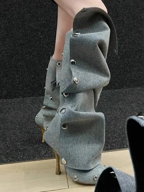 High Heel Long Boots for Women Botte Winter Boots Shoes Botas Mujer Thin Heeled Pointed Denim Metal Button Shoe Zapatos De Mujer