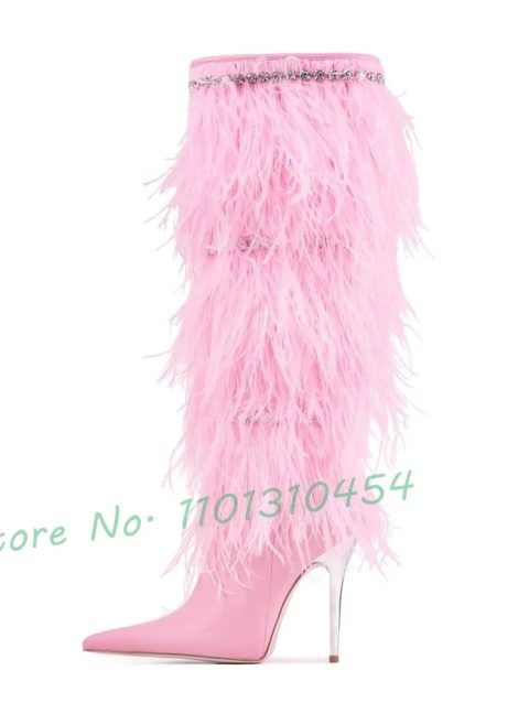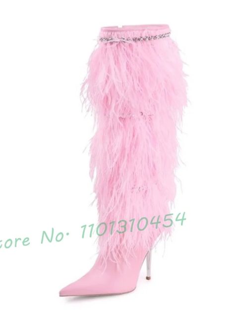 Knee-high Feather Heeled Boots With Jewel Chain Women New In Elegant Pink Long Boots Outfit Hot Winter Party Large Size Shoes