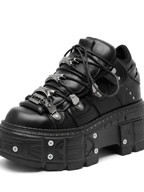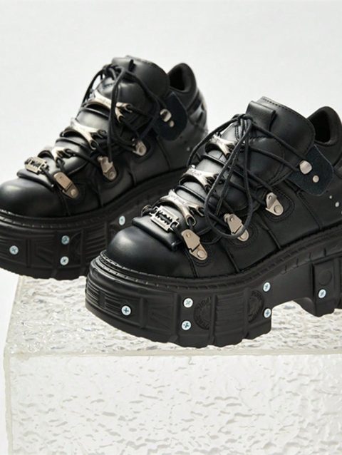 Punk Style Women Black Shoes Rock Metal Decor Lace-up Heel Height Platform Shoes Gothic Man Sneakers Women Ankle Boots 2025 New