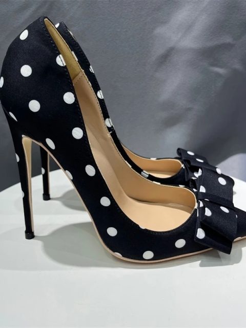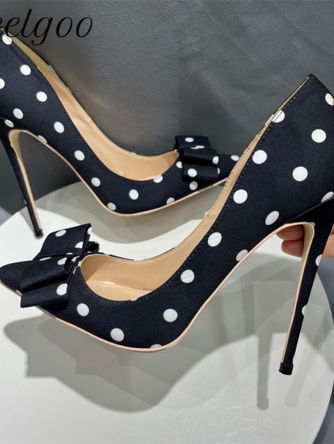 Heelgoo Polka Dot Bow Women Black Satin Sexy Pointy Toe High Heel Shoes Elegant Ladies Party Dress Stiletto Pumps Size 33-46